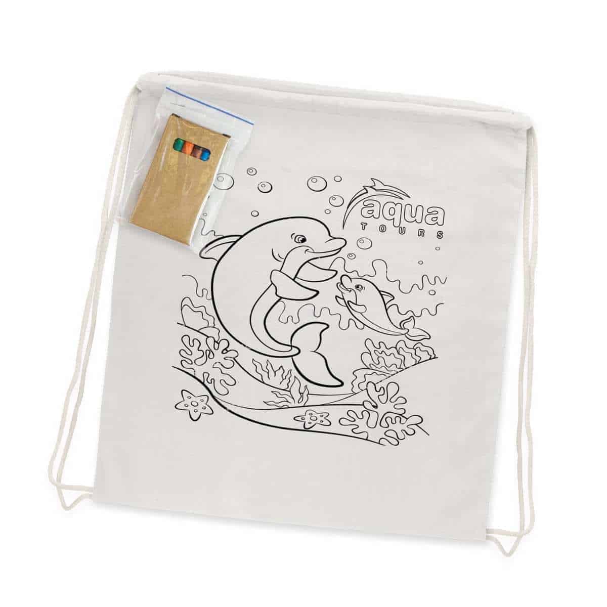 Description: 120gsm cotton drawstring backpack which is supplied with a packet of six non-toxic crayons inside. The backpack is branded with a customised design for colouring in. It is ideal as an interactive product for raising awareness or sell it as a fundraiser and run a competition.