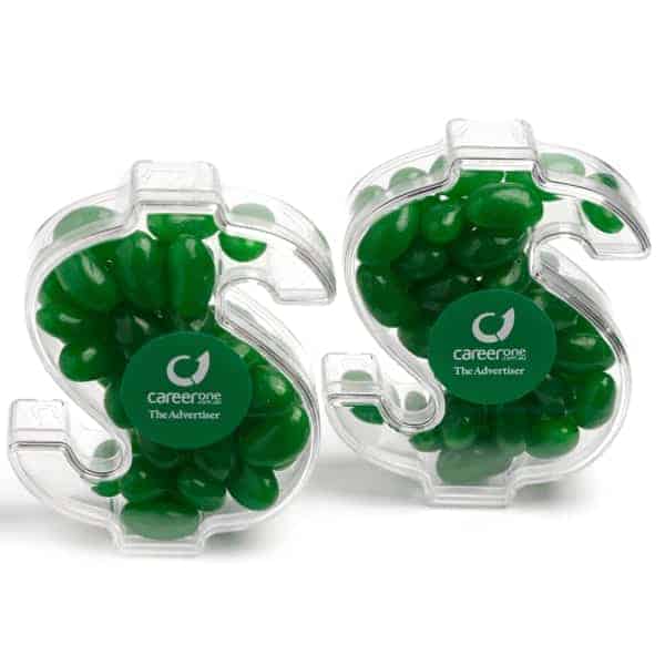 Description: Acrylic dollar filled with jelly beans 40G (Mixed or Corporate Colours)